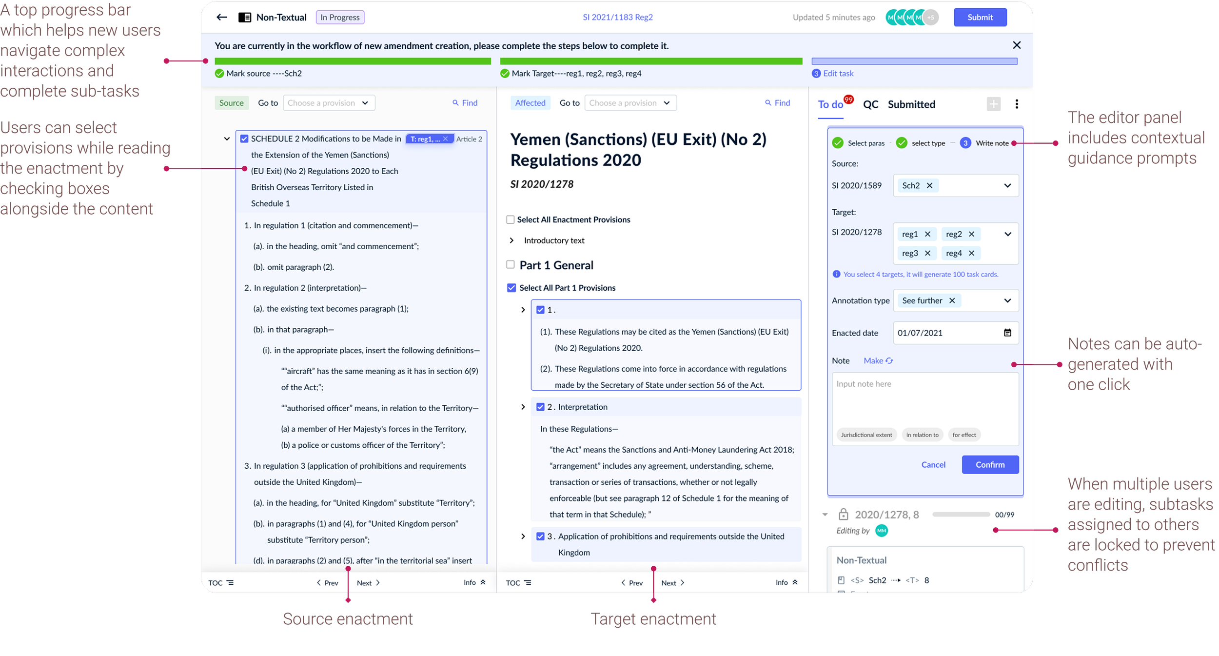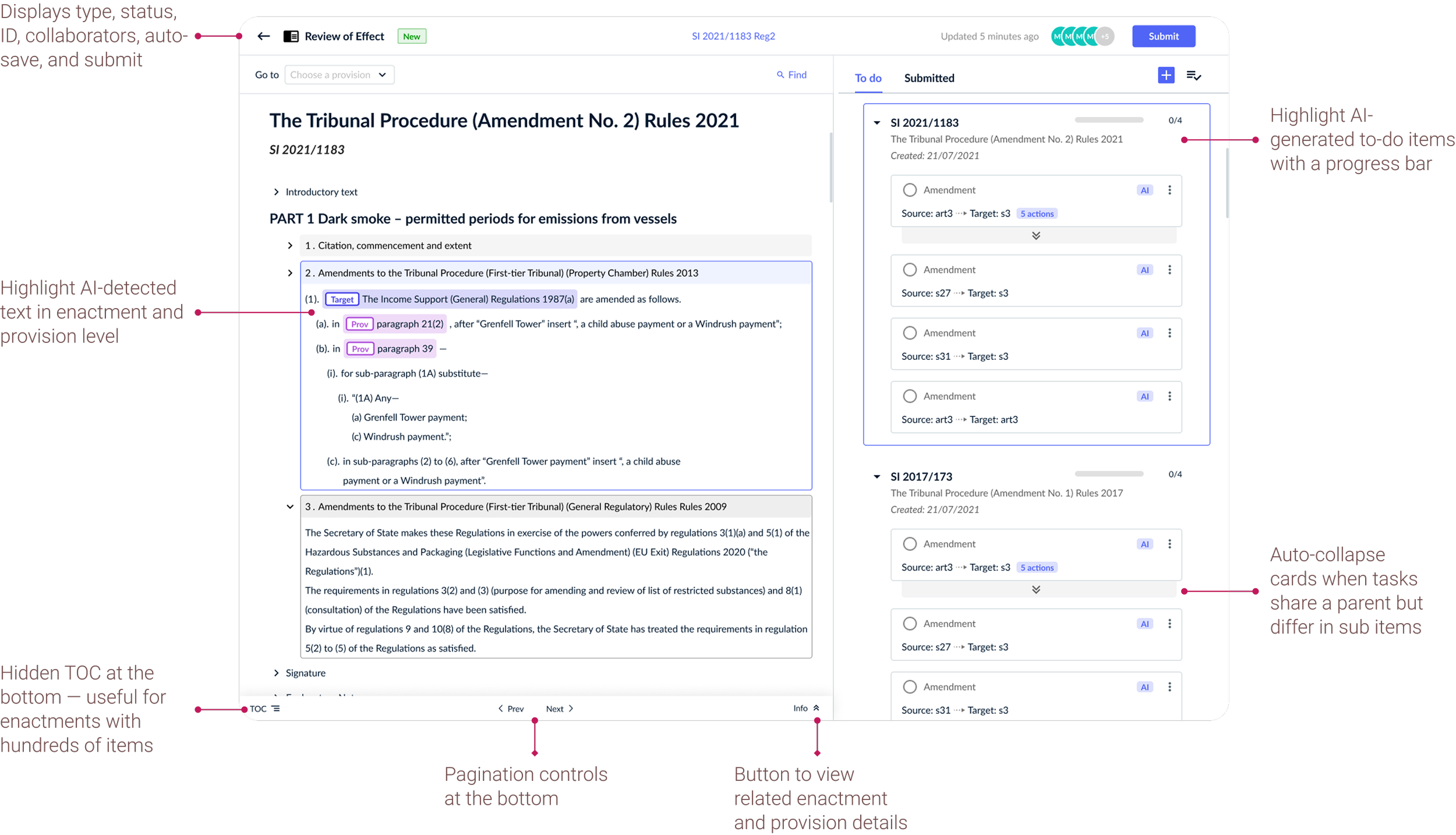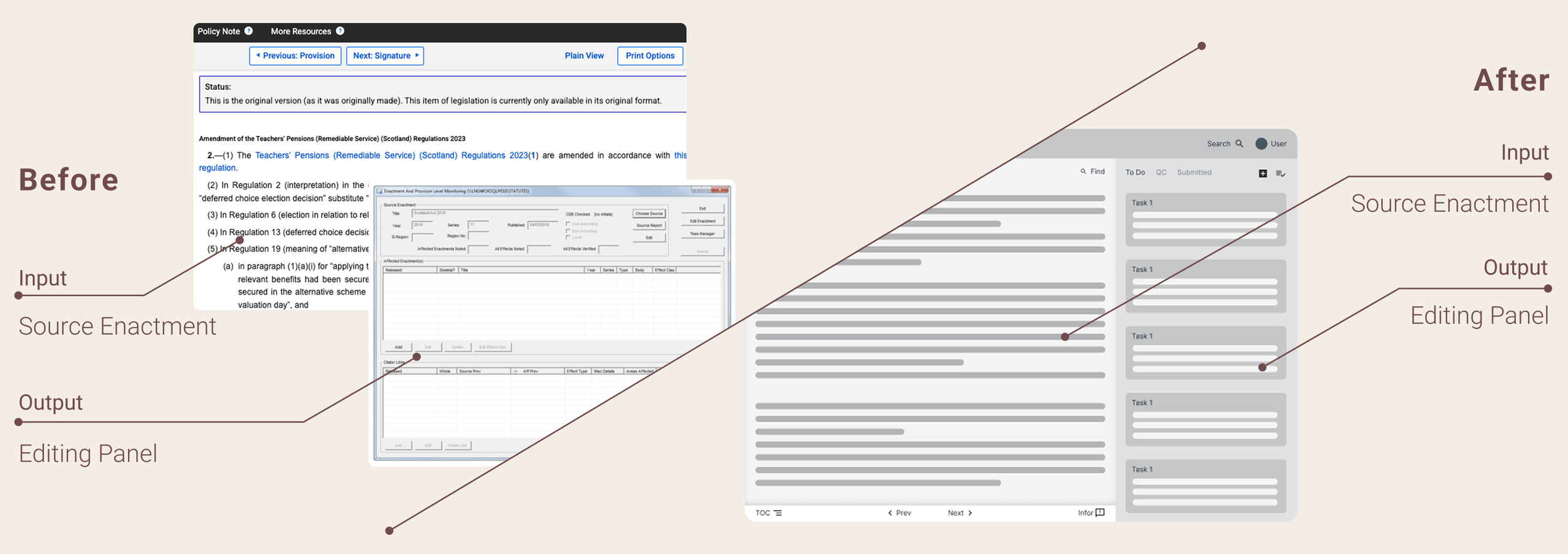 For over 30 years, the UK legislation service has relied on an editorial team to edit and update content from official sources, using more than 10 tools. Our goal was to redesign this complex workflow—integrating AI automation, consolidating the tools used across different scenarios.